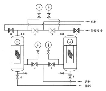 | 5. 雙桶自動(dòng)(手動(dòng))反沖洗精細(xì)過濾器 (1)適用范圍:連續(xù)運(yùn)行的工況 (2)控制形式:設(shè)置手動(dòng),PLC程控和計(jì)算機(jī)閉環(huán)控制三種形式。 (3)性能特點(diǎn):濾材穩(wěn)定可靠、控制靈活多變、多罐并聯(lián)、連續(xù)運(yùn)行、反洗率高、操作方便。 (4)基本結(jié)構(gòu)形式如圖33,也可特殊設(shè)計(jì)和制造。 |