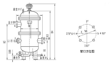 注:①本過(guò)濾器的連接法蘭,一般按HG20593-97PN 1.0MPa設(shè)計(jì)制造,用戶如需其它標(biāo)準(zhǔn)的連接法蘭或相關(guān)尺寸及排污閥方向等需變更時(shí),請(qǐng)?jiān)谟嗀洉r(shí)說(shuō)明。